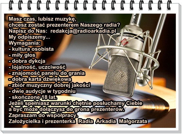 Radio "Arkadia" powstało 17 września 2015 roku, jest radiem internetowym i niekomercyjnym. Chcemy dotrzeć do każdego słuchacza dlatego nie skupiamy się tylko i wyłącznie na muzyce śląskiej lecz na różnych gatunkach muzycznych. To u nas można posłuchać poezji i muzyki klasycznej. Można też wysłać pozdrowienia, a my w miarę swoich możliwości postaramy spełnić Wasze muzyczne życzenia. Celem radia Arkadia jest promowanie utworów i zachęcanie do kupowania oryginalnych płyt.Jest to zgodne z ustawą o prawie autorskim z dnia 1 sierpnia 2000r. Nadajemy w jakości 320 Kbps i jest to zgodne z umową licencyjną "Zaiks". Radio nie ma z tego tytułu żadnych zysków. Nasze radio emituje muzykę aby umilić Wam czas wolny a słuchając Nas możecie oderwać się od rzeczywistości. To radio gdzie możecie pozyskać odrobinę radości w tej szarej codzienności. Pozdrawiamy i zapraszamy życząc miłego odbioru.